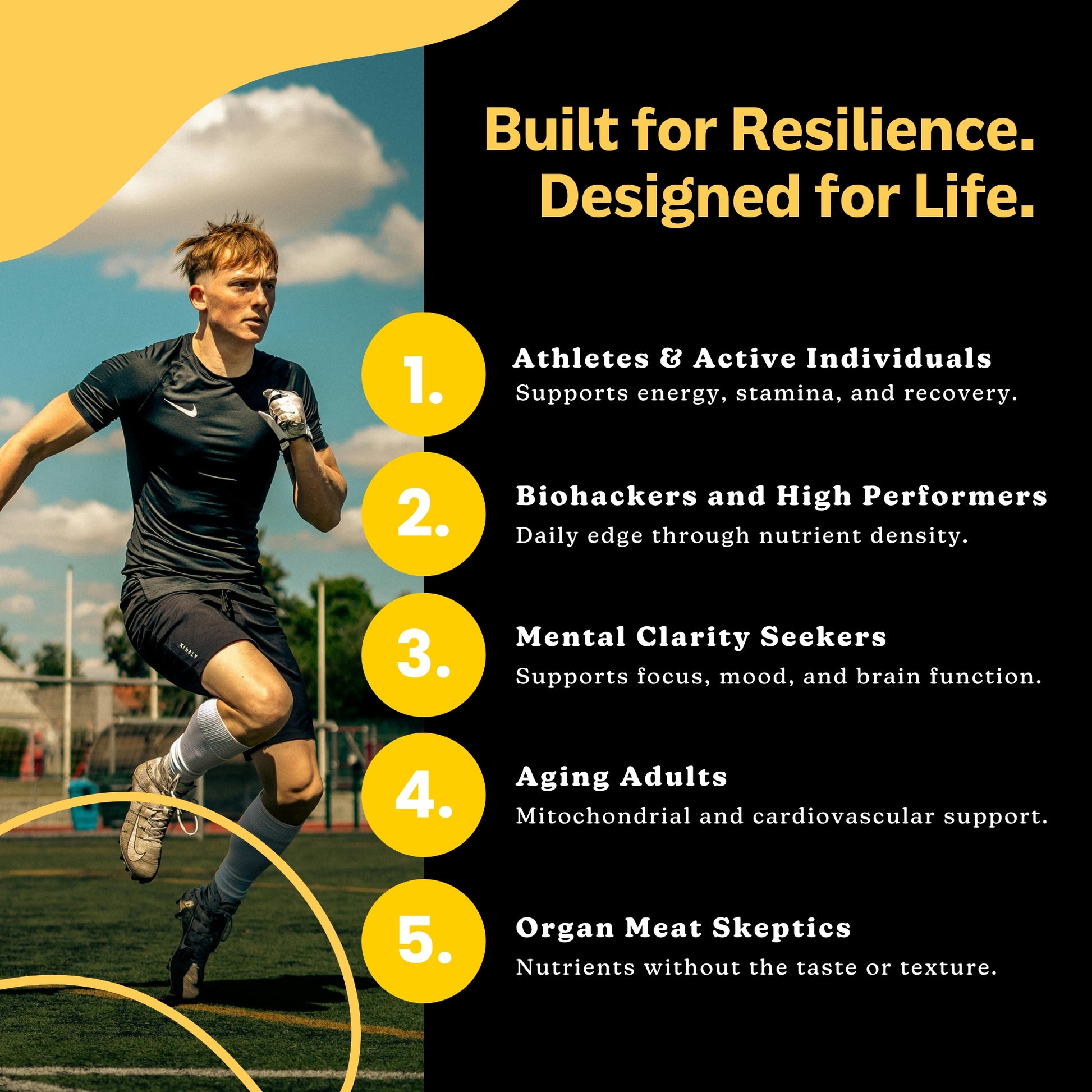American Beast delivers naturally occurring heme iron and B12 from bison liver (supporting oxygen transport and energy metabolism) plus heart‑derived nutrients like CoQ10 and carnitine (supporting mitochondrial energy and recovery).