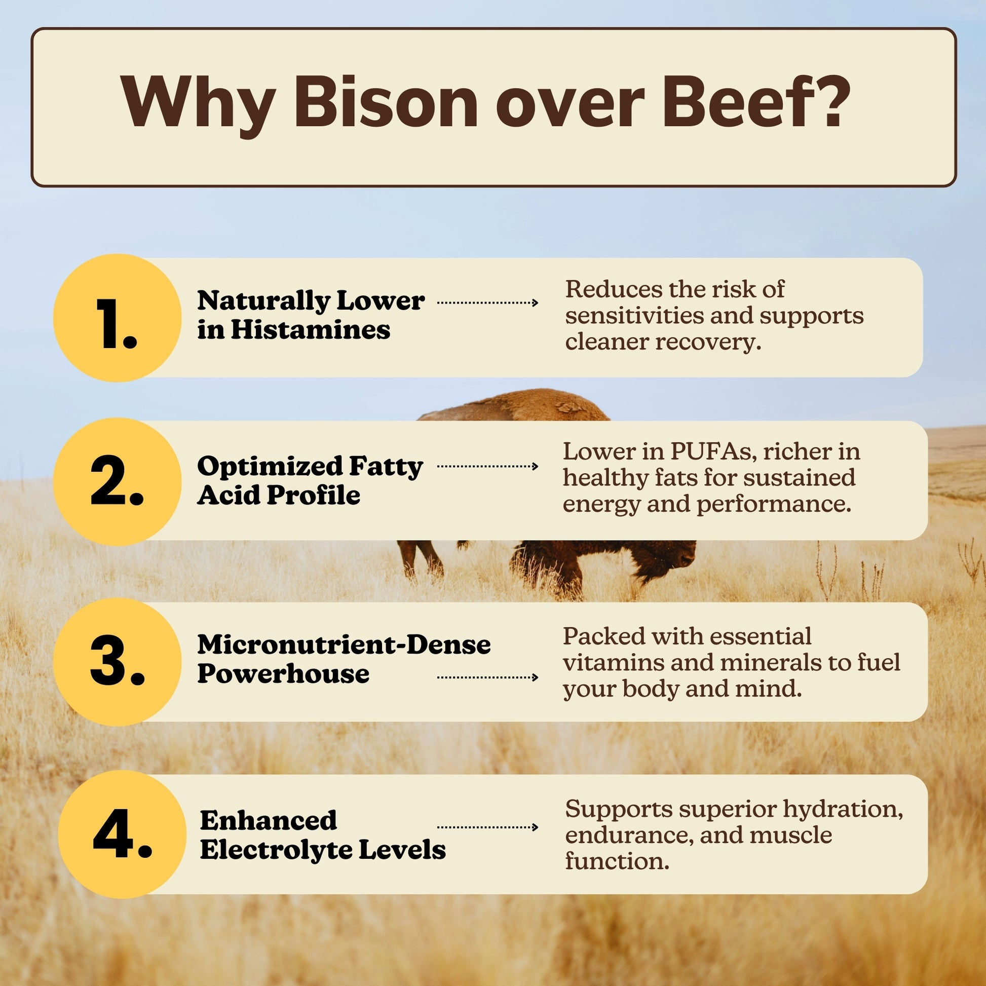 Bison liver and heart are naturally low in histamines, rich in healthy fats, and packed with essential vitamins, minerals and electrolytes. The result is steady energy, enhanced endurance, and support for peak physical performance.