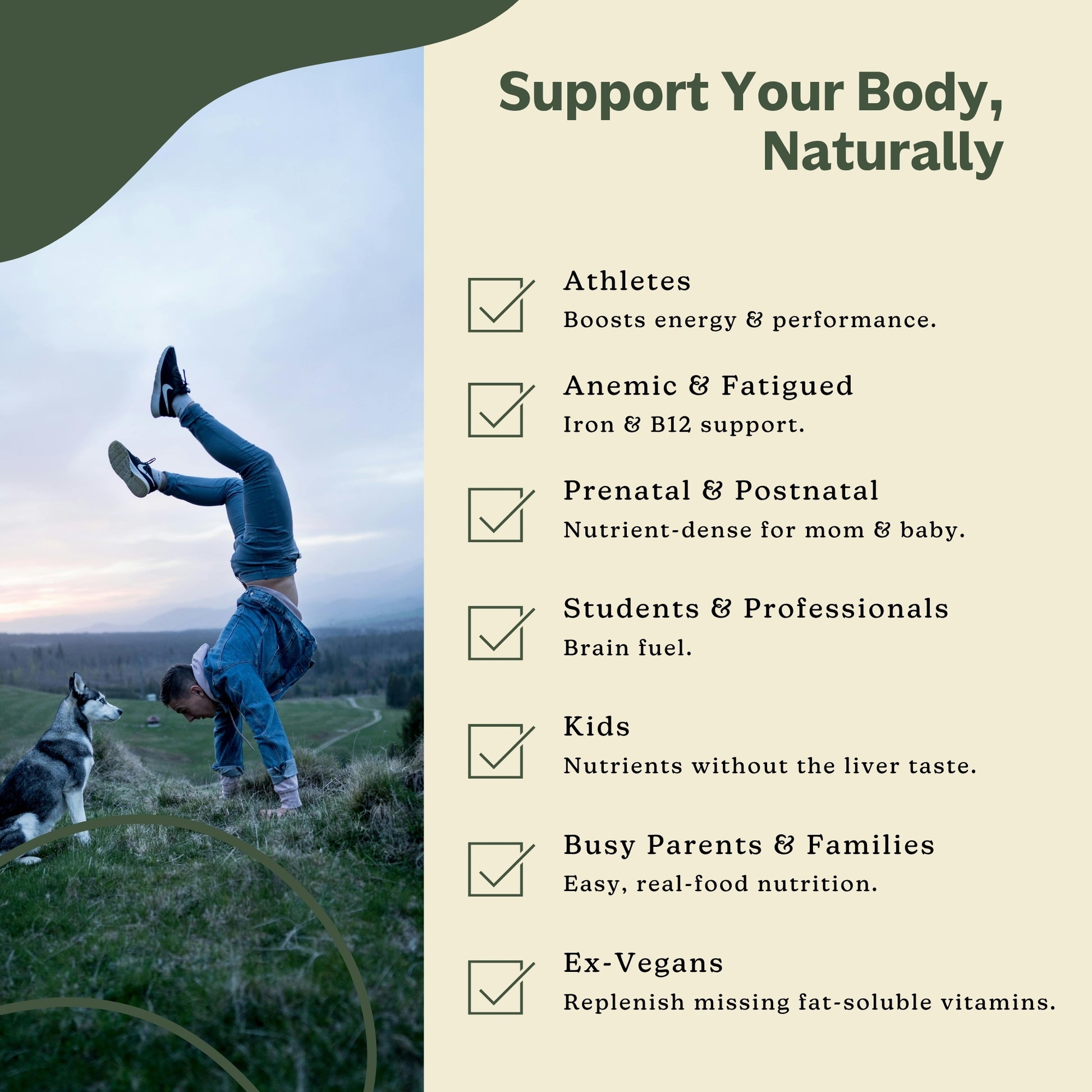 100% pure, additive-free, and sourced from grass-fed and grass-finished U.S. cattle. No hormones, antibiotics, pesticides, or GMOs. Freeze-dried for maximum nutrient retention. Beef Organs deliver the full spectrum of ancestral nourishment.